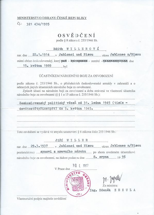 Edita Willerová se díky neshodám otce A.K. s manželem p.Willerem přemístila do Prahy, kde se s manželem skrývali až do záchytu na začátku roku 1945. Naštěstí se již jednalo o poslední odsuny a s poměrně velkým štěstím se těsně před koncem války dostali díky Rudé armádě z koncentračního tábora domů.
