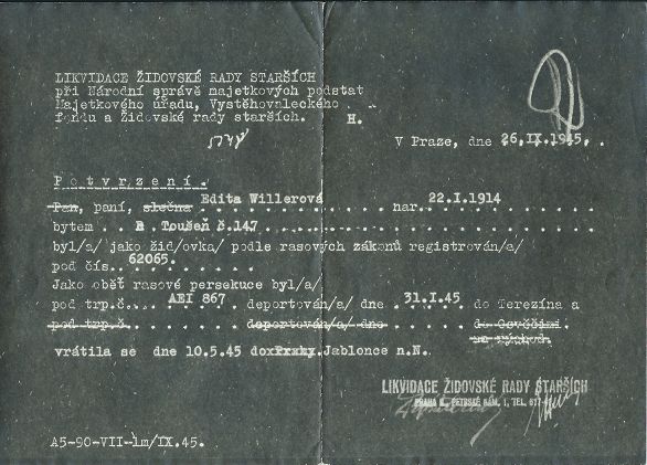 Celá rodina se nejdříve přemístila blíže Praze (do Čelákovic a poté do Toušeně pravděpodobně s ohledem na problémy v Sudetech). Avšak i zde je dostihla šílená německá myšlenka vyhladit židovské obyvatelstvo a postupně byla rodina vyjma Edity Willerové poslána do koncentračních táborů (Osvětim, Terezín atd.) – transportní lístky jsou v galerii.