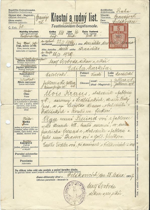 Rodina Aloise Krause v té doby čítala následující členy (náboženstvím: izraelité) Alois Kraus (původem z Českého Brodu, vyrůstající v Čelákovicích) 1886-1939 Český Brod Olga Krausová (původem z Jablonce n.N. ) Děti: Edita Krausová (dále Willerová) 22.1.1914 - Kurt Kraus 1917-1944 Osvětim Margot Krausová (dále Smilowská) 25.7.1920 –